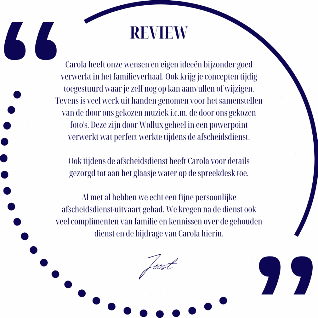 “Carola kon echt perfect – ook terug te horen vanuit de reacties van familie – persoonlijk weergeven waar het écht om ging. Met een lach, met een grap, maar zeker ook de mens echt gezien hebbend.” Bernadette